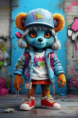 hip hop Graffiti whimsical monster, teddy bear girl creature with cute Chibi eyes. Wear a blue hat and blue shoes, holding a soda bottle, cans of spray paint in ground with walls covered in graffiti behind her. Graffiti, Hip Hop, extremely highly detailed, intricate, Colorful, sharp focus, darling, high light, photorealistich