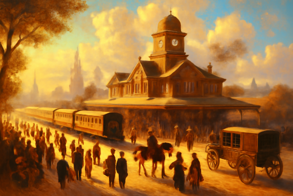 This stunning oil painting captures the energy and charm of a late 19th to early 20th-century train station at the golden hour. The scene is alive with bustling crowds in period attire, the iconic clock tower of the station, and a steam train making its way into the platform. A horse-drawn carriage and the warm light of a setting sun bring a sense of nostalgia to this timeless artwork.