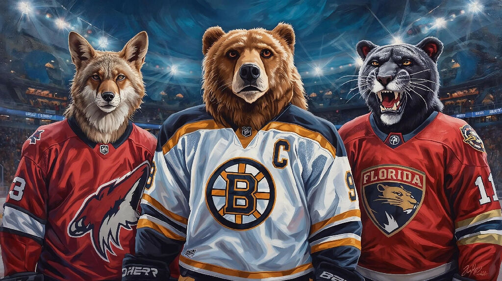 Parody painting of some hockey animal teams featuring The Arizona Coyotes, The Boston Bruins and The Florida Panthers.