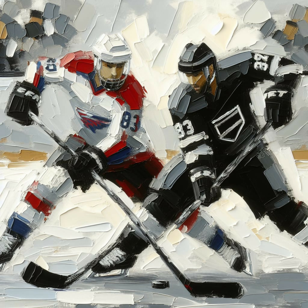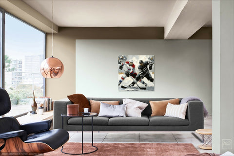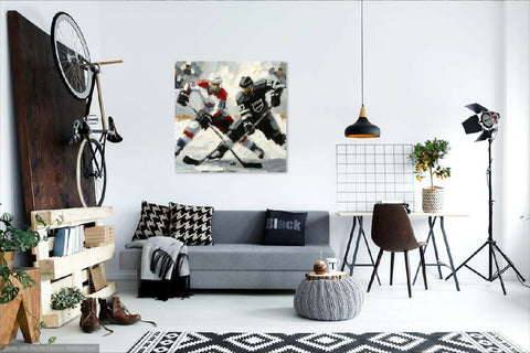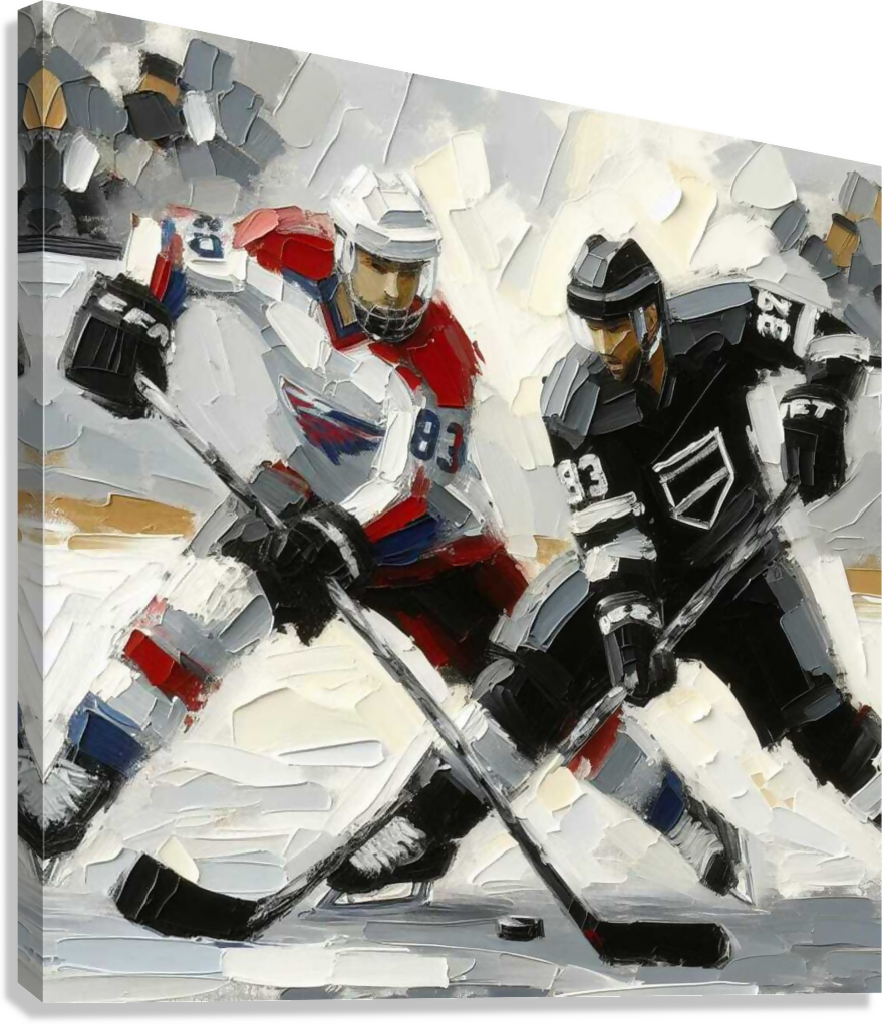 The painting depicts two ice hockey players in the thick of their game.