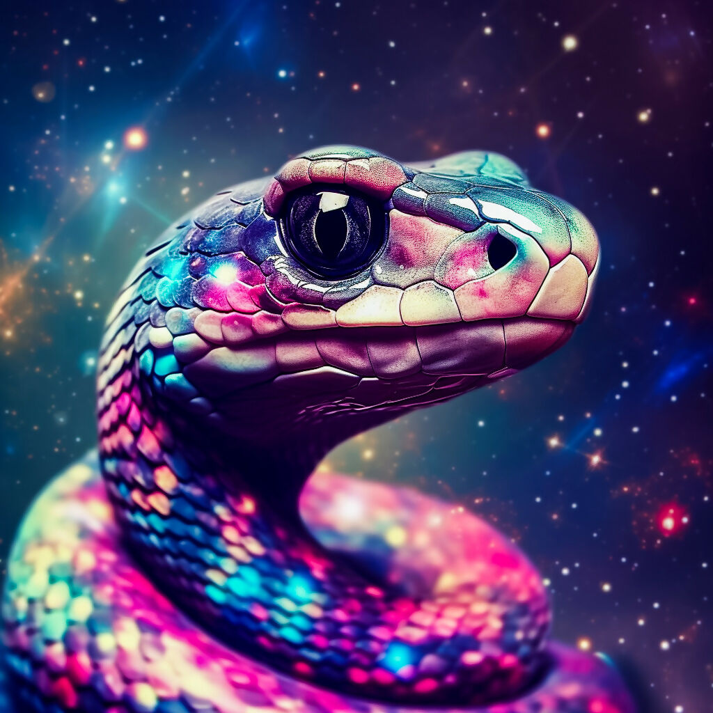 Embark on an extraordinary journey with this mesmerizing artwork featuring a holographic snake gracefully navigating the boundless expanse of space. This surreal scene masterfully blends the ethereal beauty of a shimmering, holographic serpent with the awe-inspiring backdrop of the cosmos. Edited with precision using Adobe Photoshop and Lightroom, the artwork captures vivid colors, intricate details, and captivating textures that create a truly otherworldly experience.