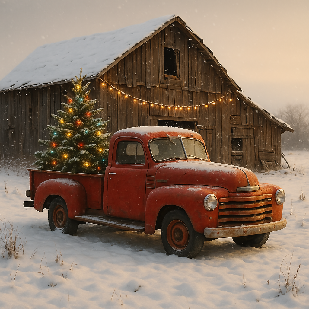 An old red truck parked in a snowy field, carrying a decorated Christmas tree, with a weathered brown barn in the background draped with drooping lights.
