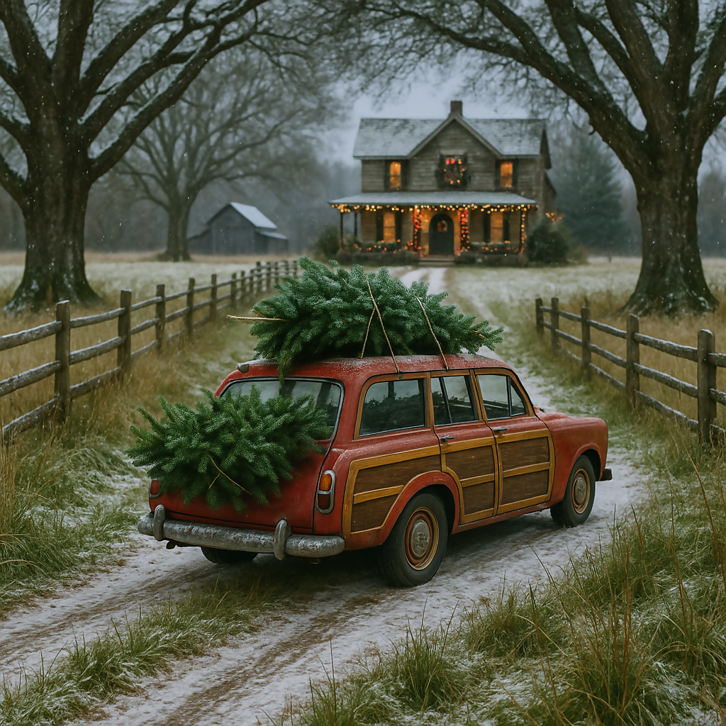 In the distance, a warmly lit homestead stands at the end, its porch aglow with festive garlands and wreaths, surrounded by long, lush grass just kissed by winter’s first dusting. The whole scene feels timeless and serene, a quiet, hopeful journey home for the holidays.