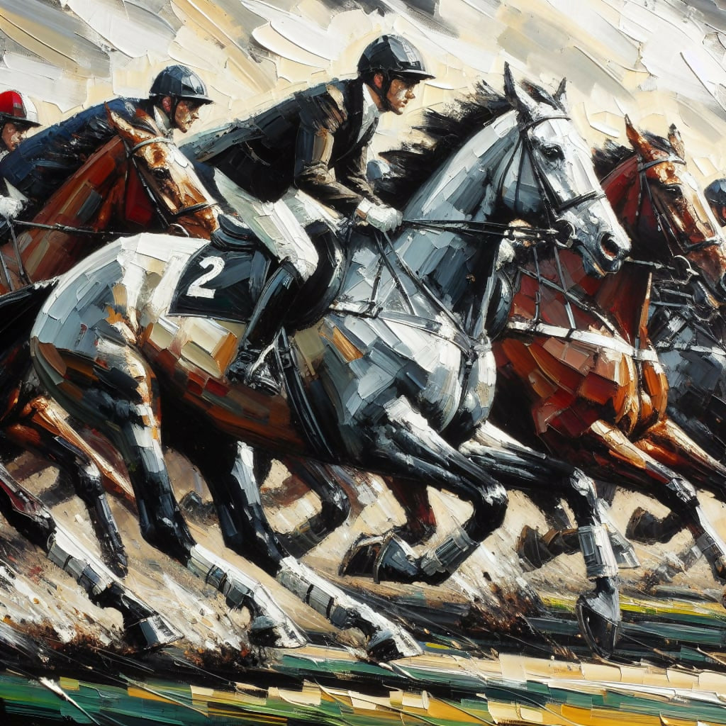 The painting is created with an oil on canvas  technique, reminiscent of late 19th century art, characterized by its rough strokes and thick layers of paint. The painting depicts a thrilling scene of horse racing. The horses are galloping with full energy, stirrups shining in silver, and the riders dressed in a mix of black, white, and red. The dynamism of the scene combinescontrasting colors that gives a modern touch to the painting.