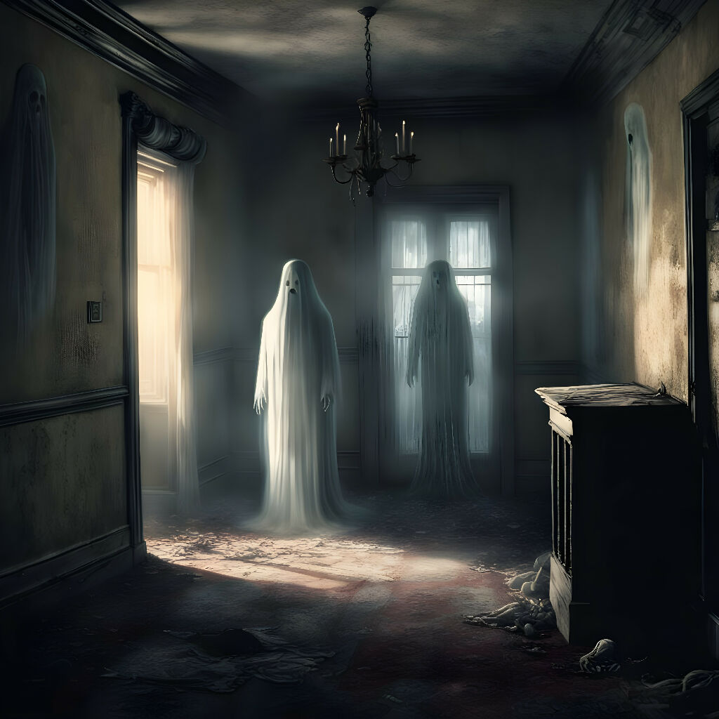 an abandoned haunted house, finding a creepy phantom like ghost creature in on of the bedrooms. Perfect for dark academia, gothic home decor, and lovers of dark art prints. Immerse your space in haunting beauty with this captivating piece. [option two of "ghostly home"]
