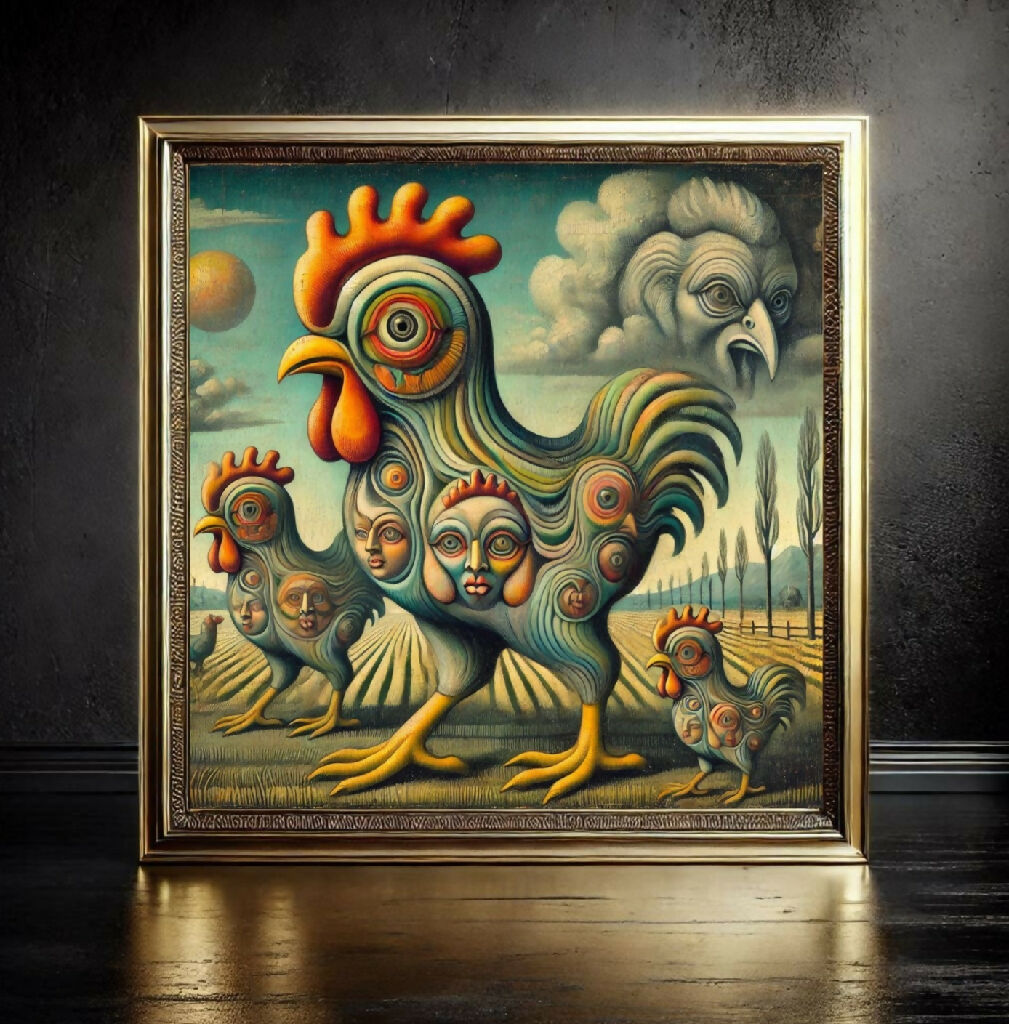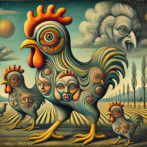 Ein surrealistischer Hahn, dessen Körper aus mehreren menschlichen Gesichtern besteht. Der Hahn steht in einem Feld mit zwei kleineren, ähnlichen Hähnen. Im Hintergrund befindet sich ein bedrohlich aussehender Wolkensturm und eine Reihe von Bäumen. Die Szene ist in einem Art-déco-Stil gemalt.
