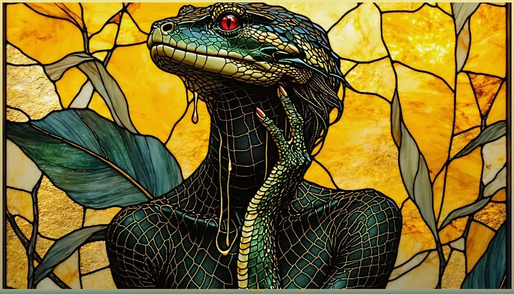 Eine Schlange erhebt sich aus Licht und Glas, ihr Leib zugleich Reptil und Fenster, Natur und Kunstwerk. Das rubinrote Auge blickt durch goldene Sonnenstrahlen, während Schuppen zu Glasmosaiken erstarren. Hier verschmilzt das Lebendige mit dem Gemachten – eine hybride Ikone zwischen organischem Wesen und sakraler Architektur.