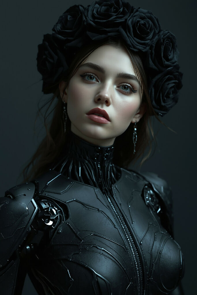 Hyper-realistic portrait of a young woman (25–28) wearing a crown of large black roses