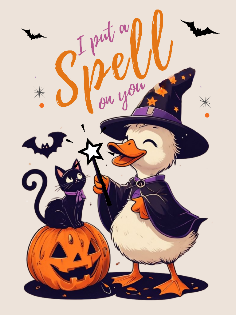 Cast a magical charm this Halloween with our whimsical "I Put a Spell on You" duck wizard digital design! This high-resolution PNG file features a cute duckling dressed in a witch hat and cape, holding a star wand and standing beside a grinning jack-o'-lantern with a black cat perched on top.