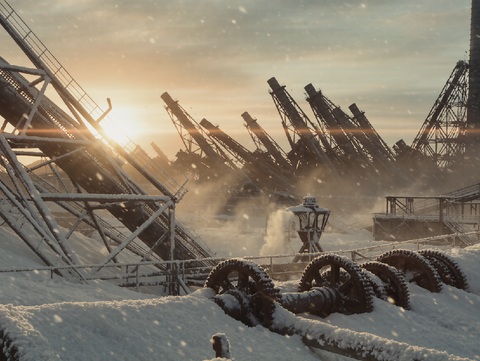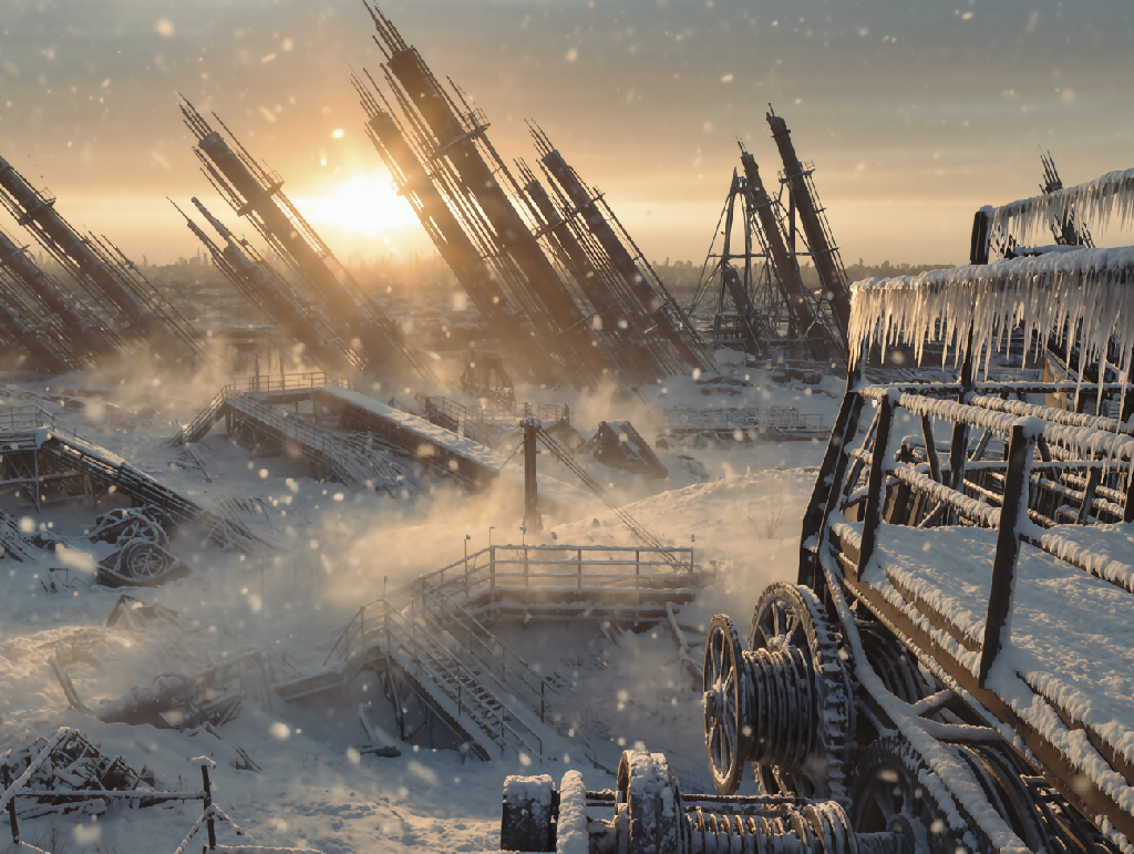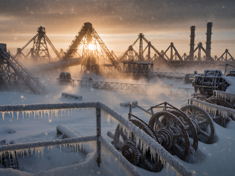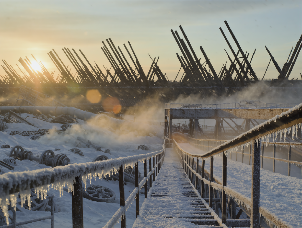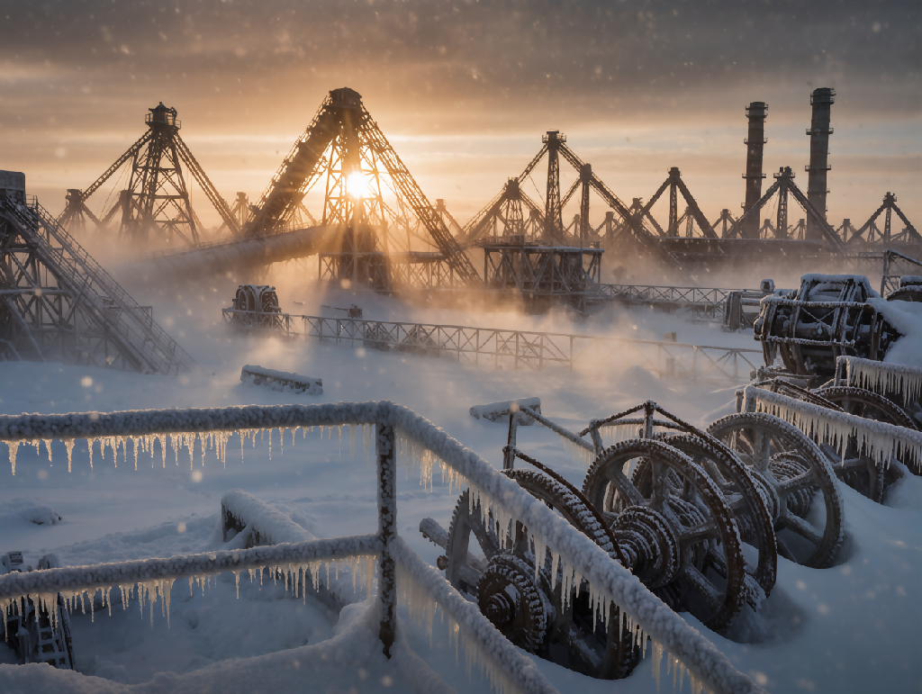 A haunting winter landscape captures the quiet chaos of a rusted, frozen factory complex bathed in sunrise light and wrapped in drifting frost.