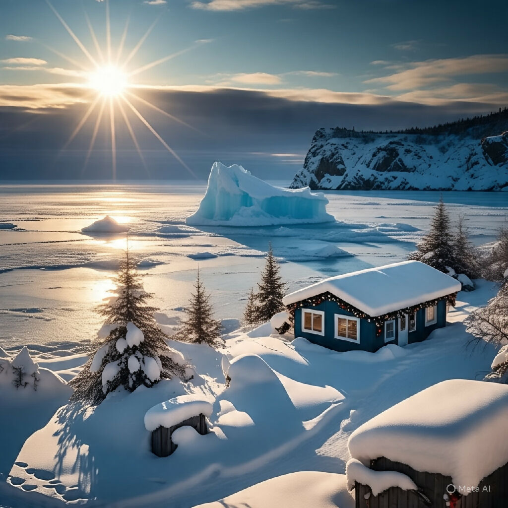 "A breathtaking winter wonderland scene featuring a majestic iceberg, snow-covered buildings, and a radiant sun shining through the icy landscape, capturing the serene beauty of a frozen paradise."