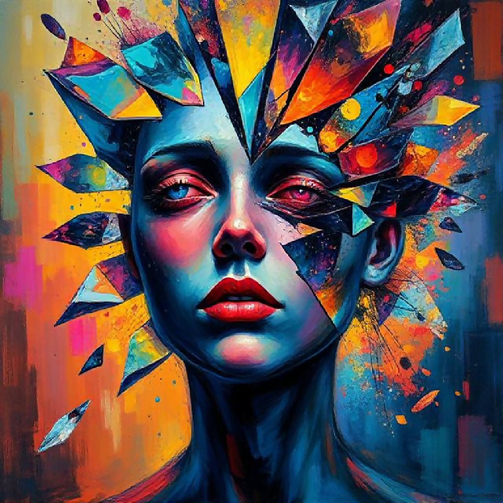 "A surreal portrait where a faceless figure breaks into crystalline shards, each fragment showing a hidden memory, dream, or secret in luminous abstract hues."
