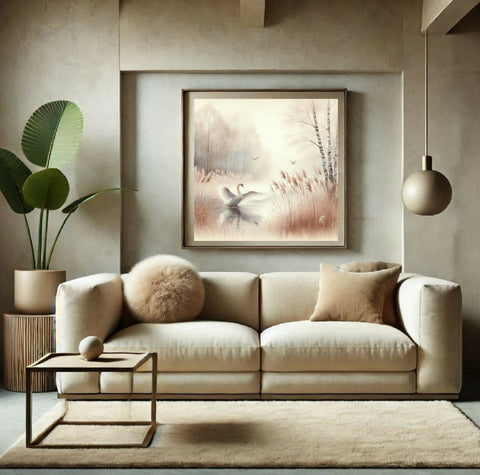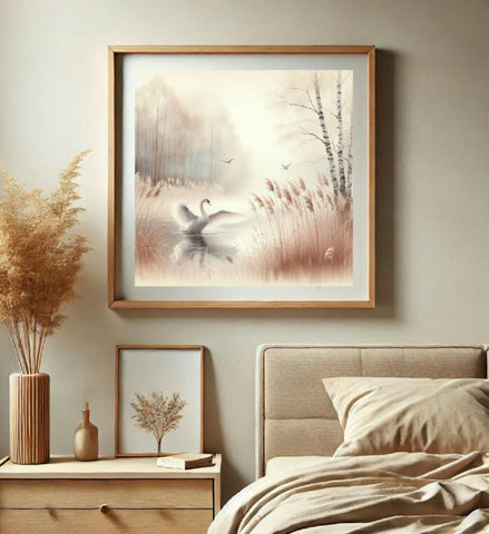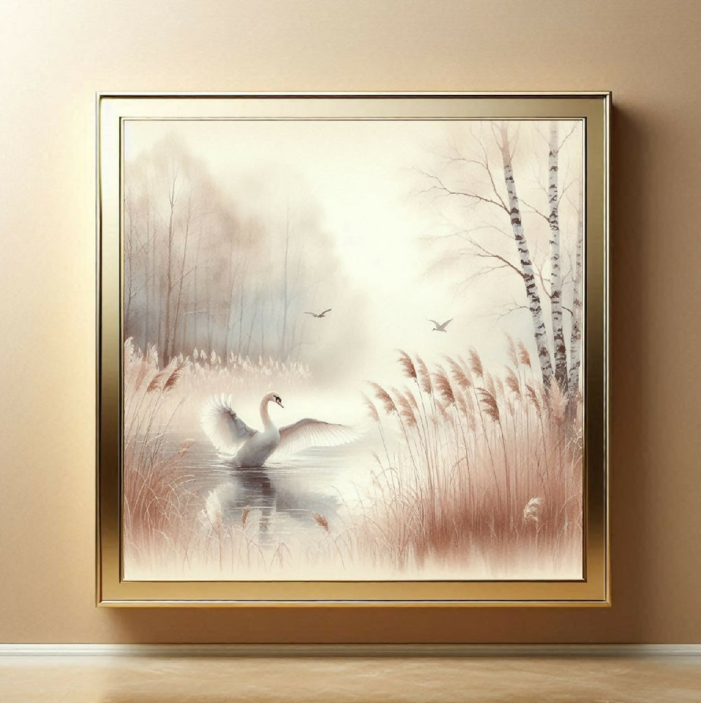 Ein Schwan auf einem ruhigen See in einem herbstlichen Wald. Die Farben sind pastellfarben und weich, mit Brauntönen, Beige und Weiß, die das ruhige und friedliche Ambiente unterstreichen. Im Vordergrund sind hohe Schilfpflanzen zu sehen, die den See umgeben. Im Hintergrund sind einige Bäume zu sehen, darunter Birken, die sich vor einem hellen, nebelartigen Himmel abzeichnen. Zwei kleine Vögel fliegen über den See. Die Szene wirkt insgesamt friedlich und idyllisch.