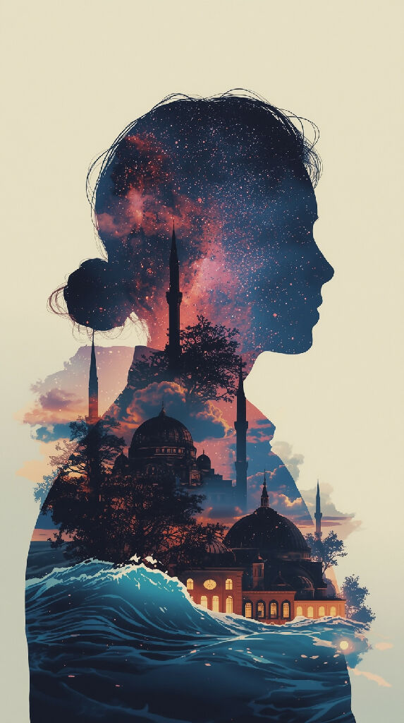 Illustrated double-exposure artwork of a silhouette overlaying diverse landmarks like temples, mosques, and futuristic skyscrapers, seamlessly blended with galaxies, nebulas, and cosmic ocean waves. Glowing neon constellations fade into tree branches, stardust merging into domes, and celestial clouds wrapping around spires. Ethereal cinematic lighting, dreamy film grain, rich layered composition, anime-inspired cosmic concept art, ultra-detailed, surreal and majestic --ar 9:16