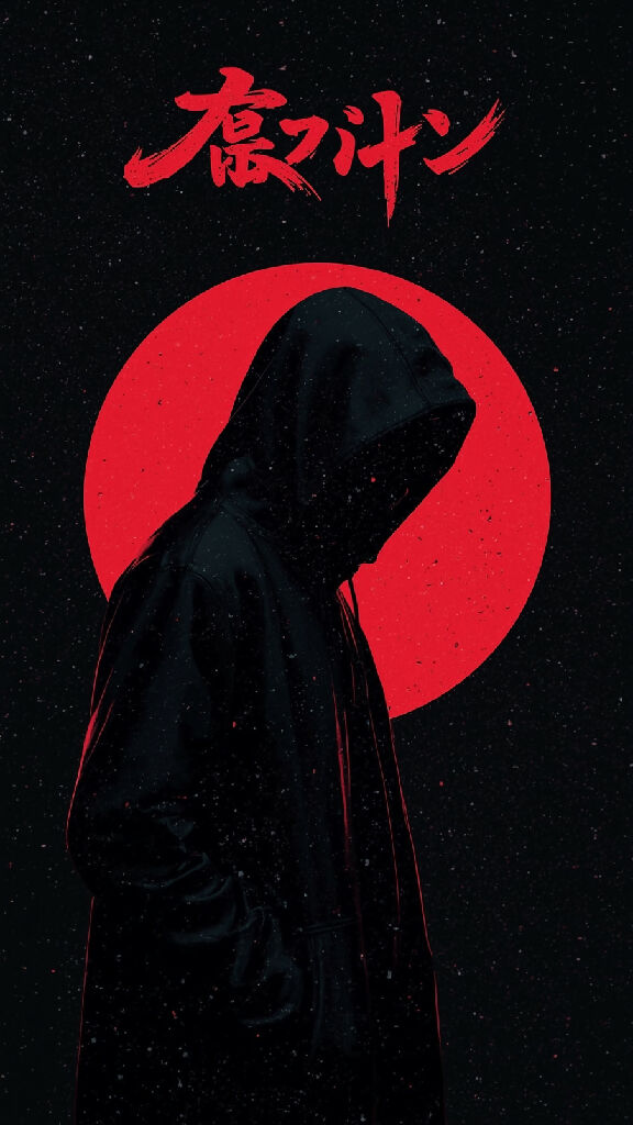 Image is a digital artwork featuring a stylized, hooded figure in a dark, futuristic outfit. The figure is positioned slightly to the right, facing forward, with a shadowed face obscured by the hood. The background is predominantly black, with a large red circle behind the figure, creating a striking contrast. Overlaid on the image are water droplets, adding a textured effect. In the upper portion, there is stylized text in a bold, angular font, colored in red and white, possibly in an East Asian script. The overall composition conveys a mysterious and cyberpunk aesthetic.