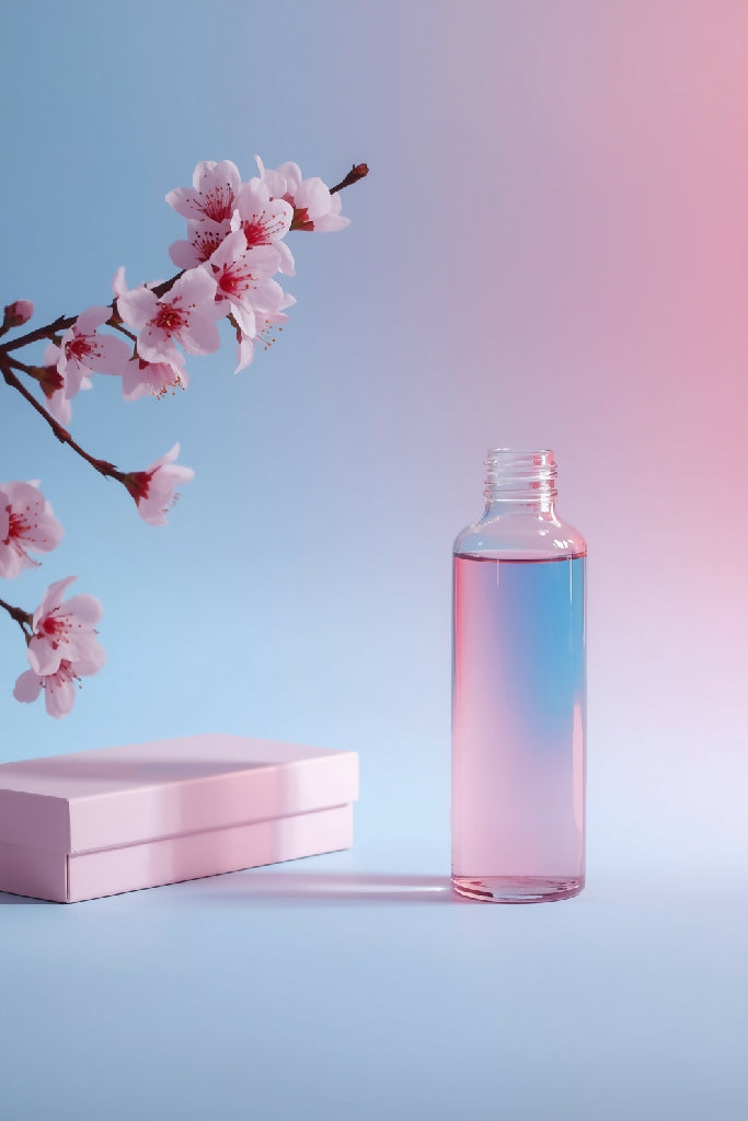 Image is a minimalist and elegant still life photograph featuring a cylindrical glass bottle filled with a gradient liquid transitioning from pink to blue