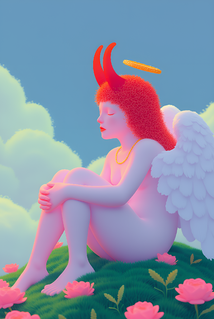 This artwork shows a calm and thoughtful figure sitting on a grassy hill, surrounded by pink flowers. The character has soft, pale skin, curly red hair, and striking red horns that contrast with the golden halo floating above their head. White angel wings add a peaceful touch, creating a mix of innocence and rebellion. The soft colors and gentle lighting make the whole scene feel dreamy and serene, as if it’s from another world.
