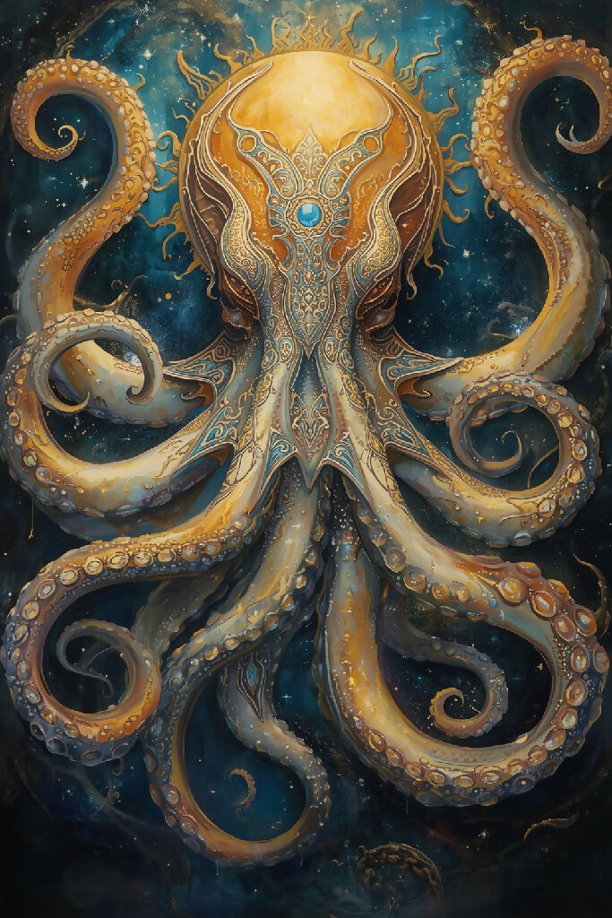 In the depths of a cosmic ocean, a chic solar tentacled titan glimmers with ethereal beauty. This otherworldly being is depicted in an intricately detailed oil painting. The colors are rich and vibrant, with shimmering hues of gold, silver, and iridescent blues that seem to dance off the canvas. Each tentacle is adorned with intricate patterns that catch the light in mesmerizing ways. The level of detail is astounding, truly bringing this fantastical creature to life in stunning clarity. There is a sense of both power and elegance exuding from the image, captivating viewers with its unique and awe-inspiring presence.