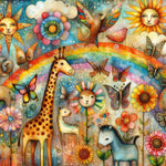 Fun whimsical fairytale scene of animals, birds and flowers. Perfect for a child's room. This creation will print out in a square configuration.