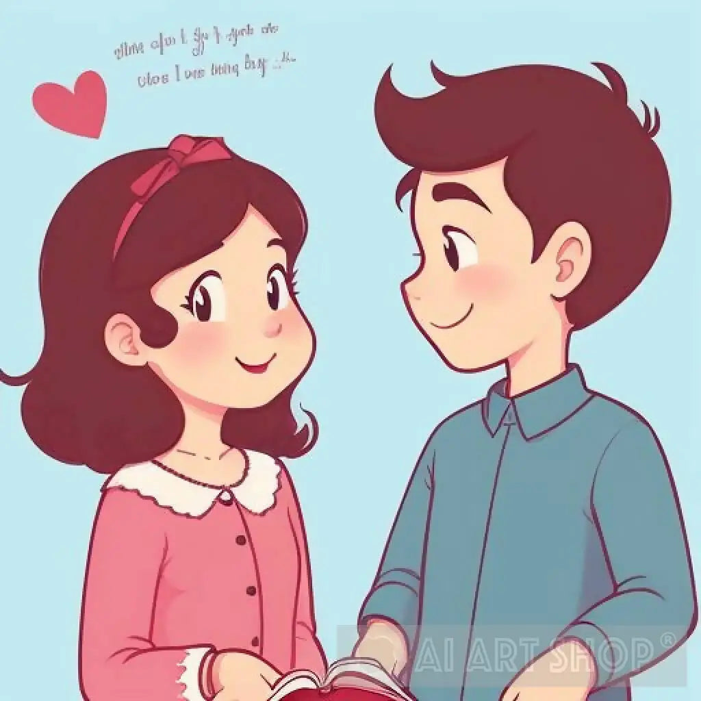 A picturesque scene unfolds on the canvas, featuring a backdrop of celestial blue. At its heart lies a whimsical cartoon depiction of a boy and a girl. The boy gazes lovingly towards the girl, while she casts a shy glance to the side.