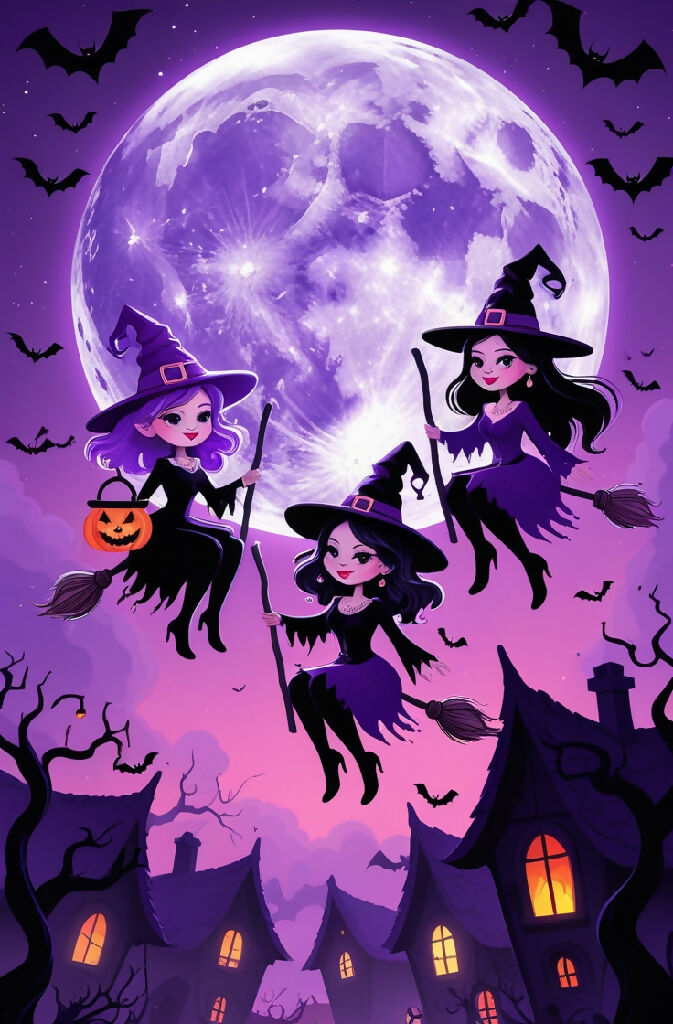In this drawing there are 4 cute women riding flying broomsticks. The first woman is a cute witch with purple hair. A cauldron is hanging from her broomstick. The second woman is a black lightskin woman with wavy white hair. She has small feather wings on her back. The third woman is a witch with a red tail and cat ears. The fourth woman is a black haired witch with cherries on her witch hat. they wearing whimsical purple witch hats, joyfully ride broomsticks a fantastical Halloween night sky. A colossal, glowing full moon in purple and pink tones dominates the background, framed by silhouettes of bats striking various aerial poses. Below, a spooky village with warmly lit windows and gnarled, leafless trees under a magical purple and pink sky creates an atmosphere that is both eerie and enchanting.