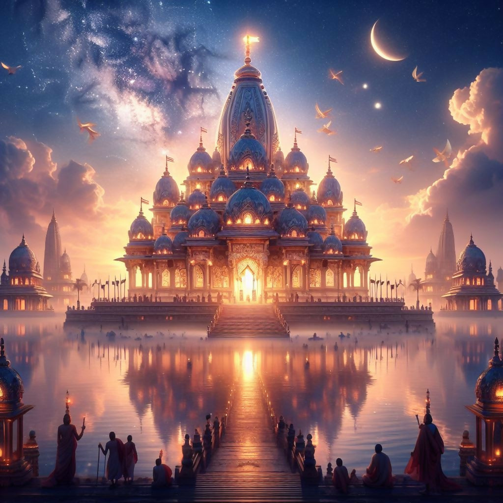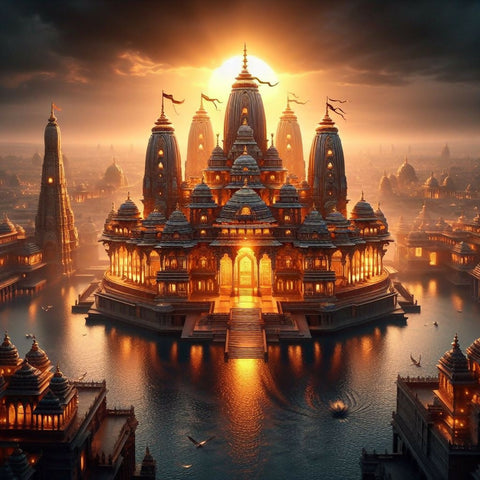 Surrounding the temples, the bustling city life adds a dynamic contrast, illustrating the harmony between the sacred space and everyday life. You can see people going about their routines, offering prayers, and engaging in rituals, which adds a layer of depth and meaning to the imagery.