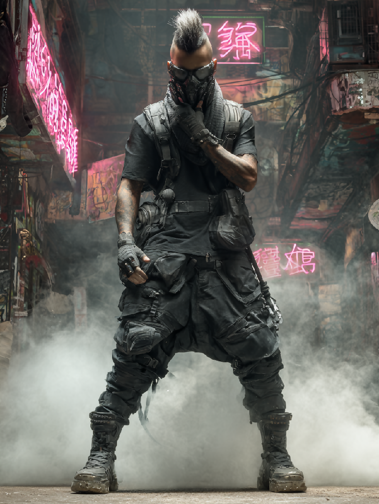 Tags: industrial music, cyberpunk fashion, dystopian aesthetic, tactical gear, mohawk hairstyle, neon city, urban warrior, post-apocalyptic style, futuristic portrait, underground culture