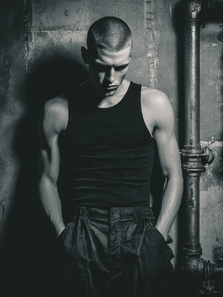 Tags: industrial fashion, black and white portrait, concrete wall, urban decay, minimalist style, metal pipe, shaved head, silent mood, dystopian realism, underground aesthetic