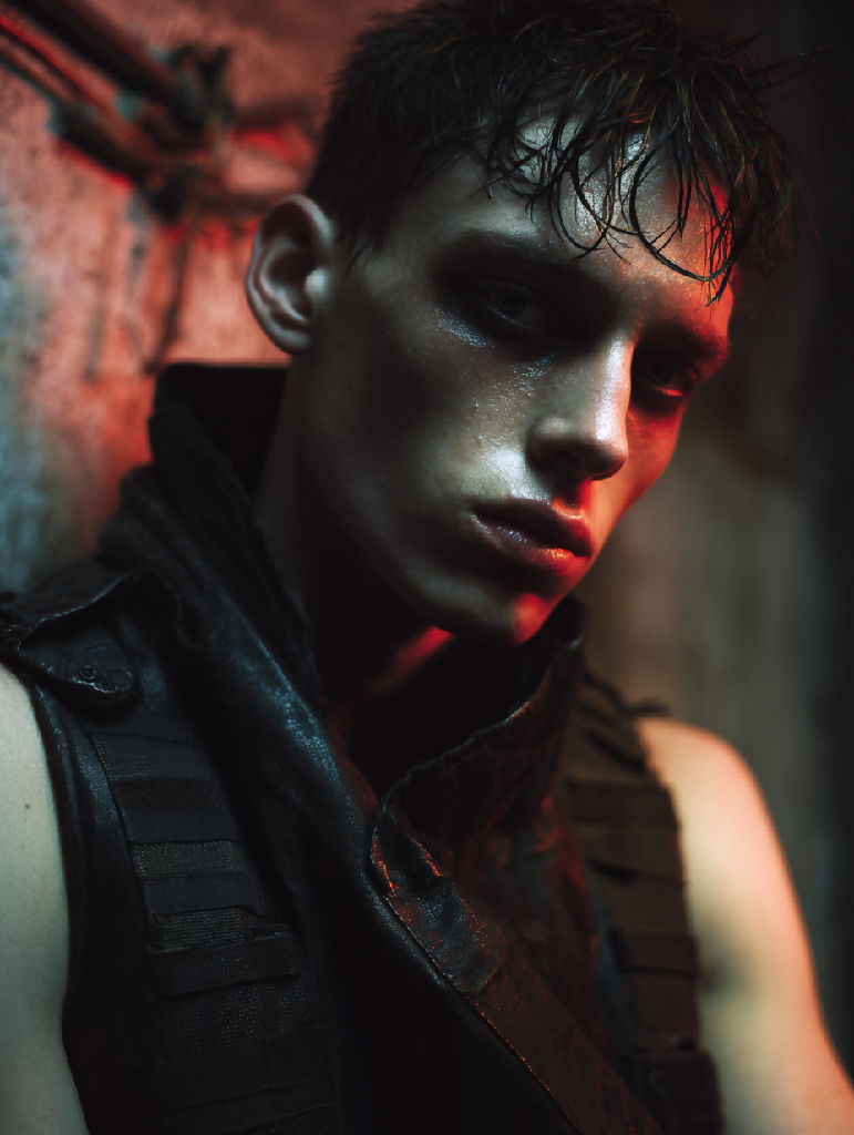 Tags: industrial fashion, tactical gear, cyberpunk portrait, urban dystopia, shoulder armor, underground style, industrial setting, neon lighting, utilitarian design, defiant presence