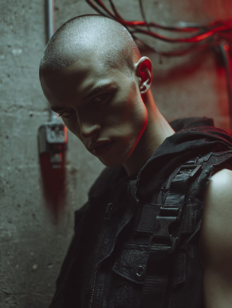 Tags: industrial fashion, tactical vest, urban decay, red lighting, dystopian portrait, cyberpunk style, underground aesthetic, concrete textures, resistance theme, gritty realism