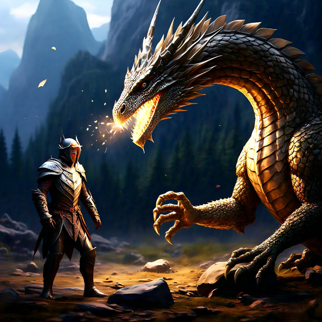 In a misty mountain forest where legends breathe fire, Inferno at Dawn captures the climactic moment of a lone knight facing a golden-scaled dragon amidst towering pines and jagged peaks. This AI-generated artwork evokes the timeless struggle between courage and chaos, set in a cinematic landscape where nature itself seems to hold its breath. The knight, armored and resolute, stands defiant as the dragon unleashes a torrent of flame—symbolizing the eternal clash of light versus darkness. Perfect for collectors who crave mythic storytelling woven into breathtaking scenery.