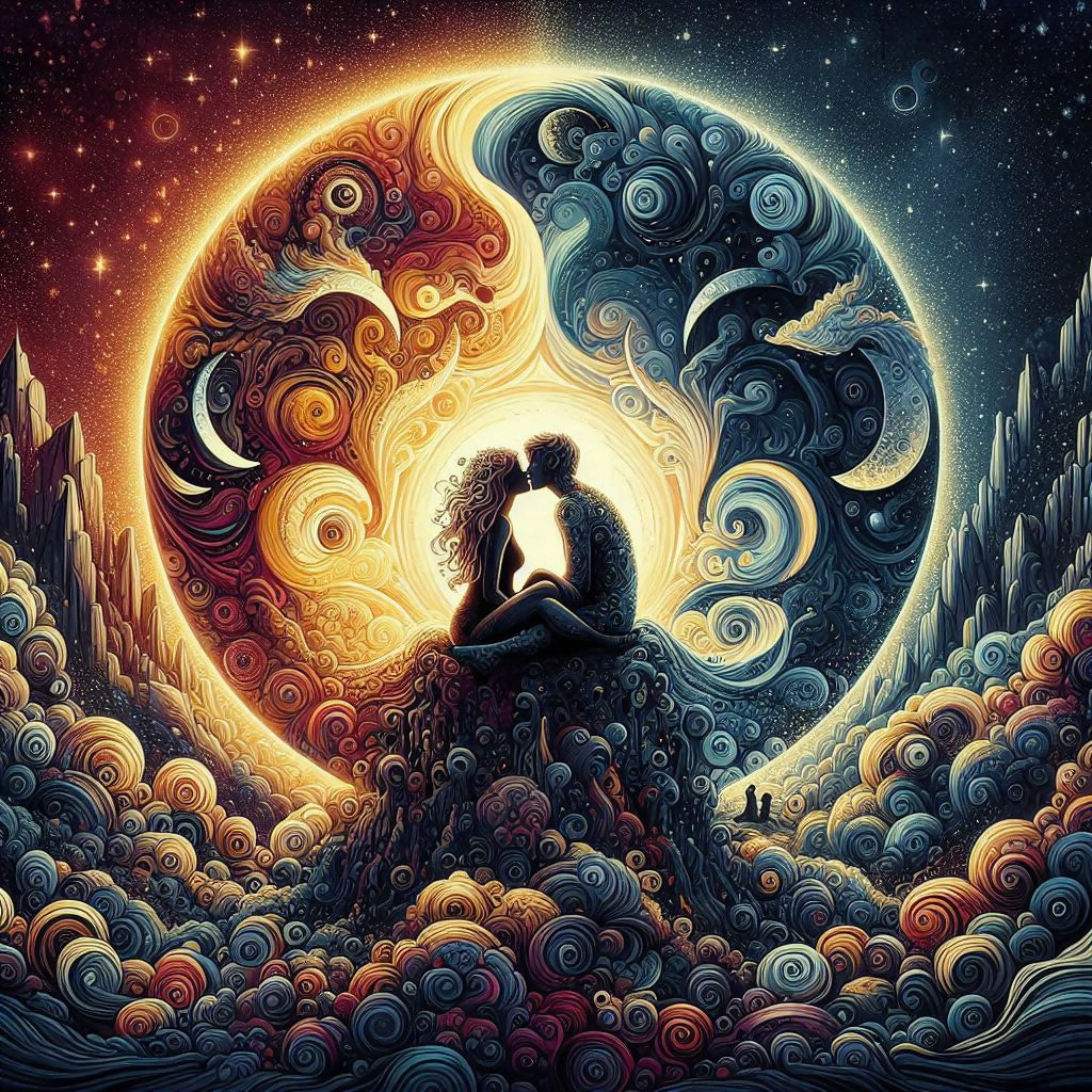 The golden hues of the sun melt into the deep blues of the night, creating a dreamlike fusion of light and shadow, symbolizing the harmony between strength and tenderness in love. Every detail in this artwork speaks of destiny, devotion, and the unspoken understanding shared by soulmates.