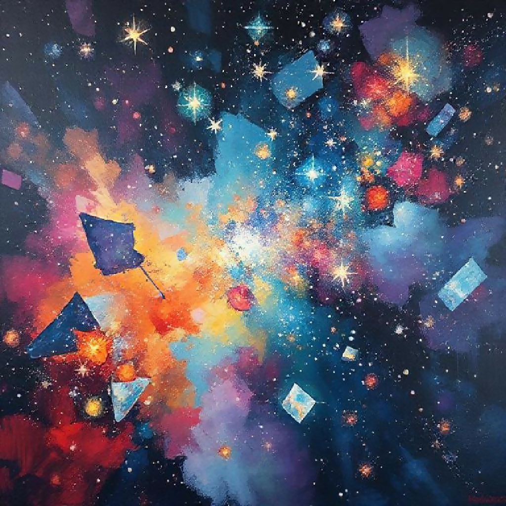 "A cosmic abstract artwork where stars shatter into crystalline fragments across the void, each piece glowing with endless possibilities, symbolizing moments scattered through eternity."