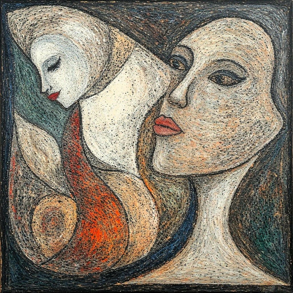 This artwork showcases two distinct yet harmoniously integrated female profiles, executed with a stippling or pointillist-like technique.