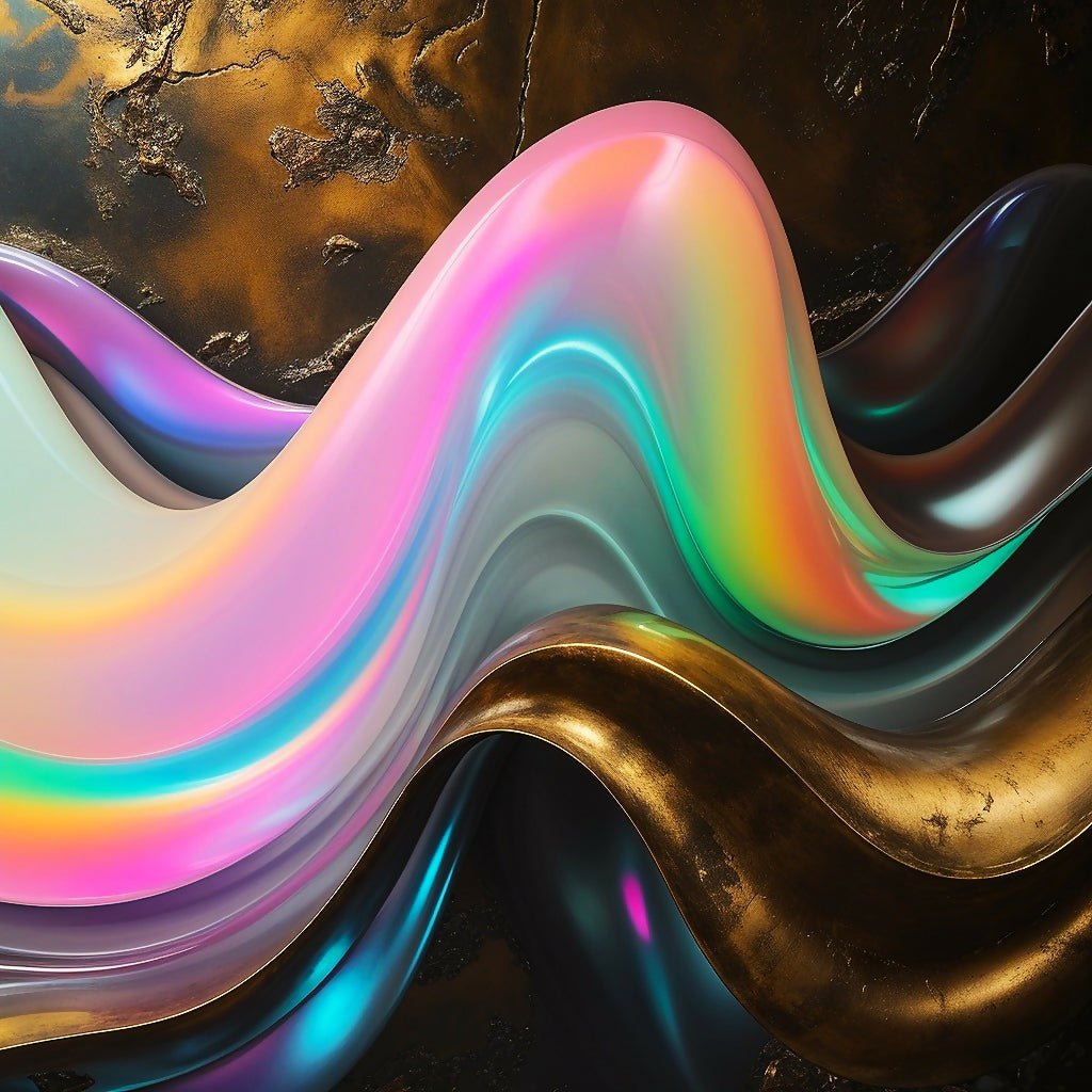 A stunning abstract composition featuring flowing iridescent waves intertwined with bronze and gold metallic structures. The dynamic contrast between luminous hues and textured metallic details enhances the artistic depth, making this a refined piece for modern interiors and exclusive art collections.