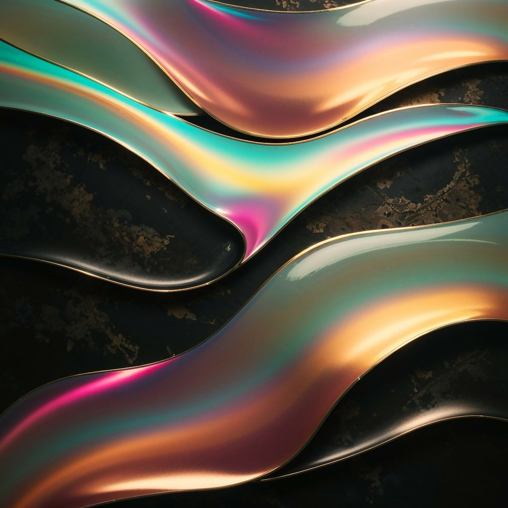 An abstract composition featuring fluid, ribbon-like metallic waves with glowing iridescent hues of blue, green, pink, and gold. The interplay of light and texture enhances the contrast, creating a captivating visual experience ideal for modern interiors and fine art collections.