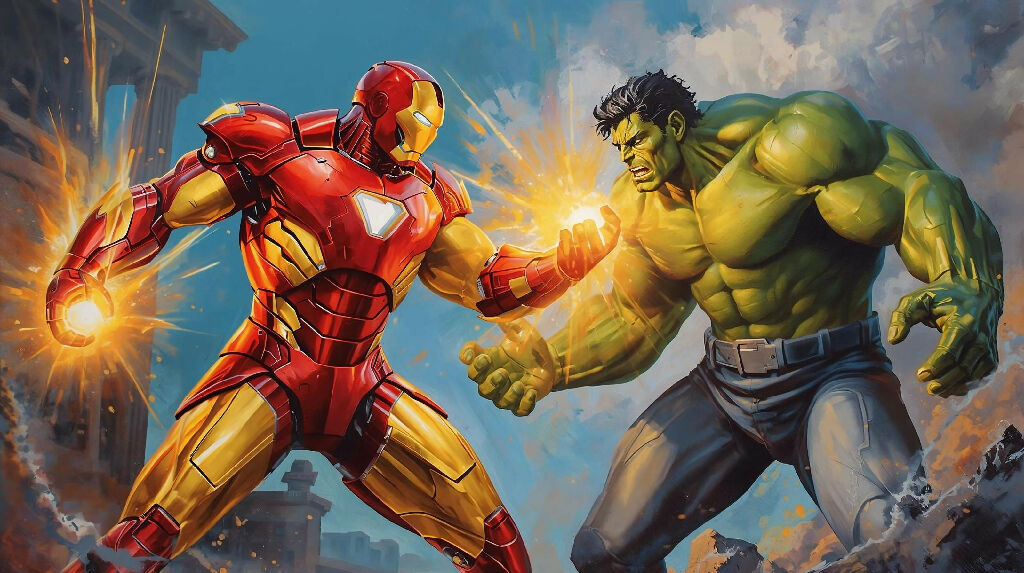 Vividly colored and detailed painting of Iron man battling the Hulk.