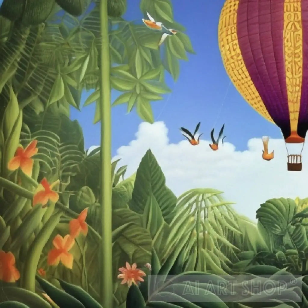 Colorful hot air balloon flying alongside some birds on a gorgeous day.