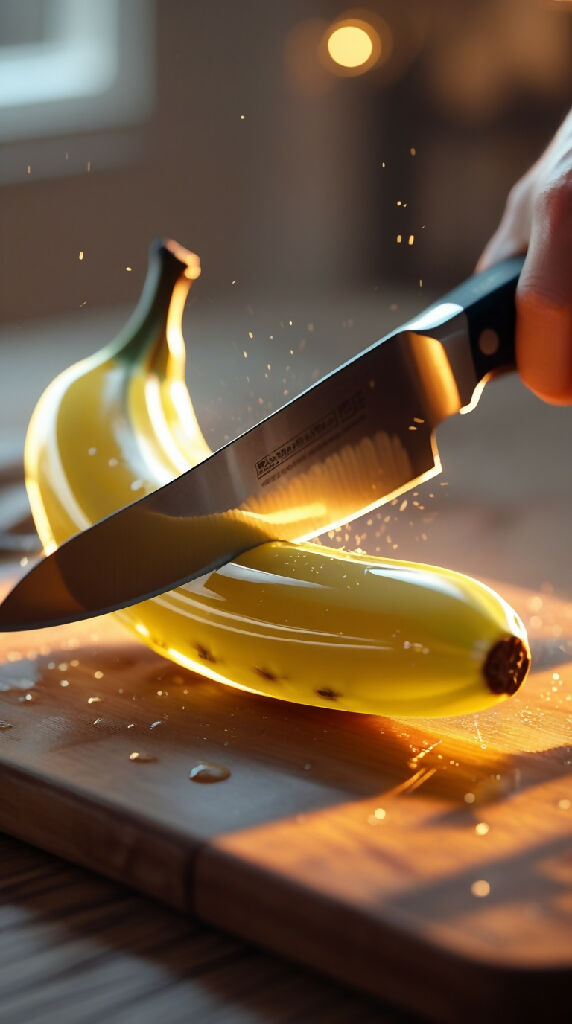 It's a Perfect AI-Generated ASMR Video. Shot in extreme macro perspective, a knife cutting a flawless, and detail-rich [soft glass banana,] into several pieces. rests on a wooden cutting board bathed in warm lighting. Each deliberate cut produces a rich ASMR soundscape in an otherwise silent room.