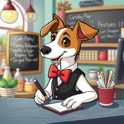 Welcome to the cafe! Our cheerful Jack Russell in a black vest and giant red bow greets you with a toothy grin while jotting down orders. Detailed shelves, plants, coffee cups, and that classic terrier energy make this piece pop with fun and warmth. Anthropomorphic magic meets everyday cafe life—perfect gift for Jack Russell fans or anyone who loves a happy barista pup!"