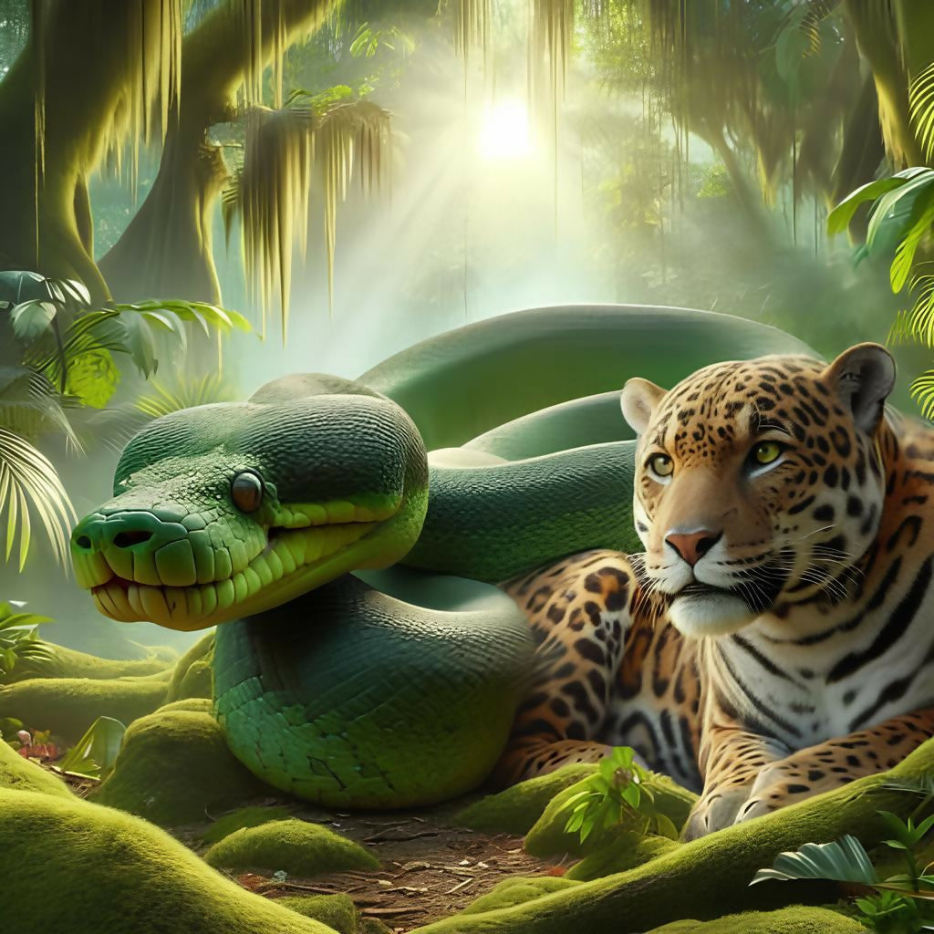 In the heart of the rainforest, a powerful jaguar and a majestic anaconda cross paths in a dramatic encounter. This vibrant digital artwork captures the raw beauty, mystery, and tension of the wild jungle—where nature's fiercest predators rule in silence.
