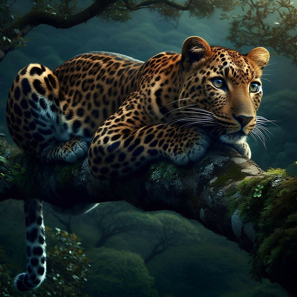 Discover the wild beauty of this AI-generated artistic image featuring a majestic jaguar resting atop a tree. Surrounded by vibrant foliage and bathed in golden light, the scene captures the raw elegance and mystery of nature’s most elusive predator.