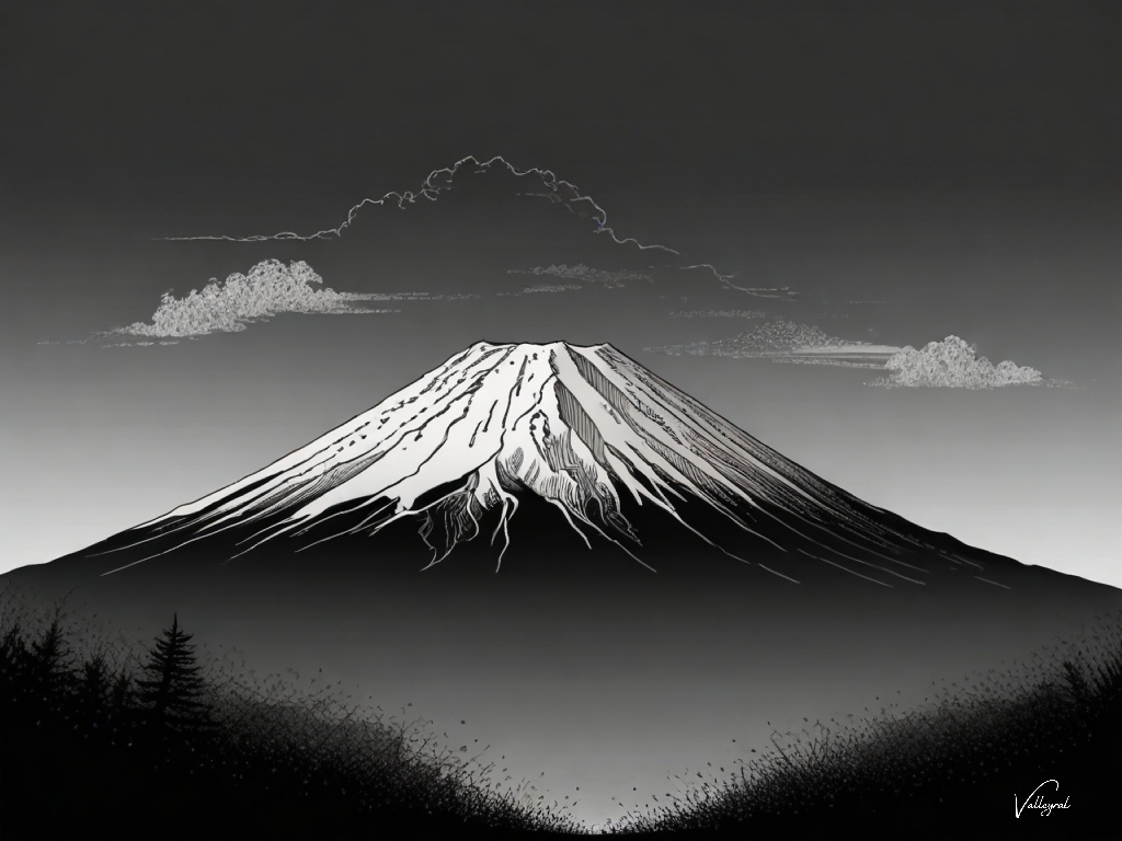 In the realm of Japanese minimalist art, Mount Fuji emerges as a timeless icon, its majestic silhouette rendered with grace and restraint in ink watercolor. Against a canvas of subdued hues—black, grey, and white—the mountain rises with quiet grandeur, embodying both strength and serenity. Each brushstroke, deliberate and fluid, captures the essence of Fuji's ethereal presence, shrouded in mist and mystery. With minimalist precision, the artist distills the essence of nature's awe-inspiring beauty, inviting viewers to contemplate the profound depths of simplicity. In this monochromatic ode to Japan's sacred peak, tranquility and transcendence converge, echoing the eternal allure of Mount Fuji.