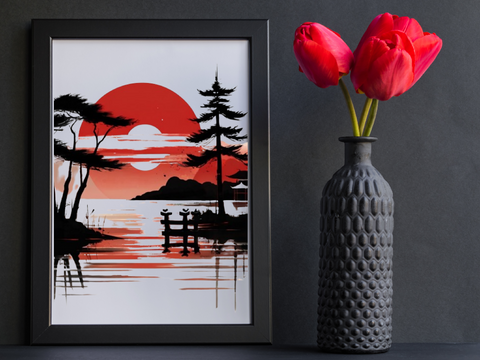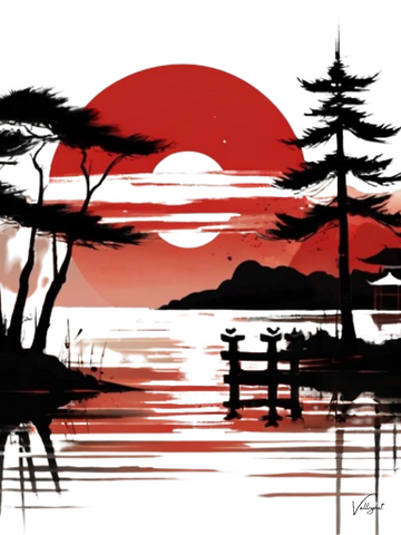 In the serene world of Japanese minimalism, this watercolor masterpiece captures the essence of tranquillity. Against a pristine white canvas, strokes of black and red delicately merge to depict a sunset casting its last vivid hues upon a placid lake. Reflective waters mirror the stark silhouette of stoic trees, their branches whispering secrets to the evening breeze. Nestled among the foliage stands a humble shrine, a beacon of spiritual resonance amidst nature's symphony. Each brushstroke embodies harmony, evoking a sense of quiet reverence for the beauty that surrounds us, inviting the viewer to immerse themselves in peaceful contemplation.