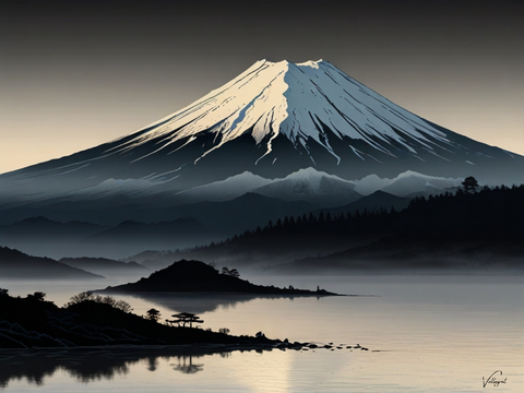 In the realm of Japanese minimalist art, Mount Fuji emerges as a timeless icon, its majestic silhouette rendered with grace and restraint in ink watercolor. Against a canvas of subdued hues—black, grey, and white—the mountain rises with quiet grandeur, embodying both strength and serenity. Each brushstroke, deliberate and fluid, captures the essence of Fuji's ethereal presence, shrouded in mist and mystery. With minimalist precision, the artist distills the essence of nature's awe-inspiring beauty, inviting viewers to contemplate the profound depths of simplicity. In this monochromatic ode to Japan's sacred peak, tranquility and transcendence converge, echoing the eternal allure of Mount Fuji.