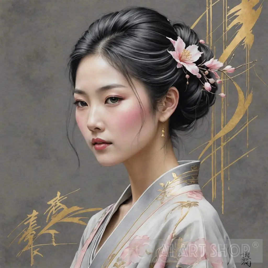 In the mesmerizing portrait of a young Japanese woman, elegance finds its embodiment. Her gleaming black hair, impeccably tied up, frames features of delicate allure, drawing the eye to her captivating presence. Wrapped in a silver-grey kimono adorned with intricate gold prints and delicate pink floral motifs, she exudes sophistication with every graceful movement. A single pink flower adorns her hair, a subtle yet striking accent to her natural beauty. Against a backdrop of dark grey, adorned with shimmering gold brushstrokes, she stands as a vision of timeless allure, harmonizing tradition with modernity in a captivating symphony of grace and refinement.