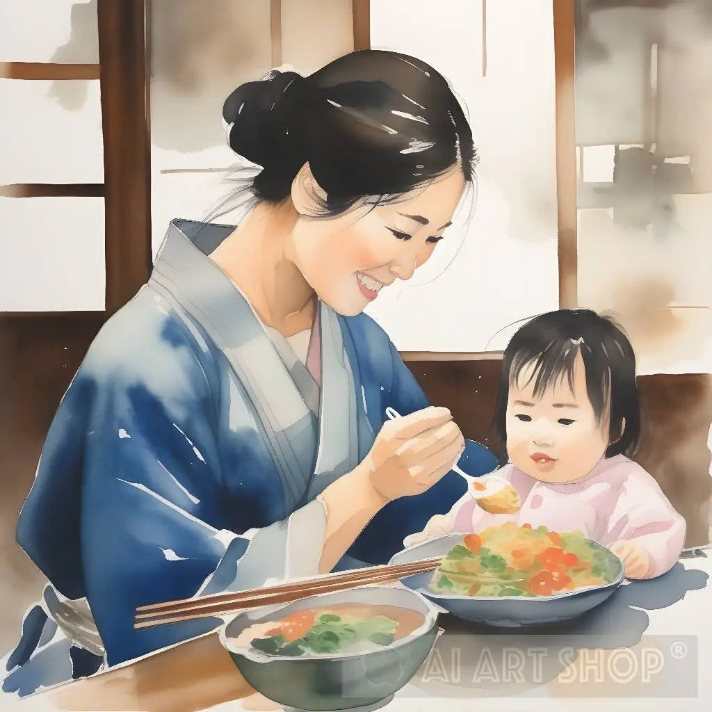 Introducing our exquisite AI-generated watercolor painting, "Harmony in Nurture." This captivating artwork beautifully captures the tender moment of a Japanese mother feeding her child.