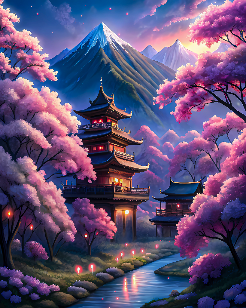 Japanese Pagoda Among Cherry Blossoms