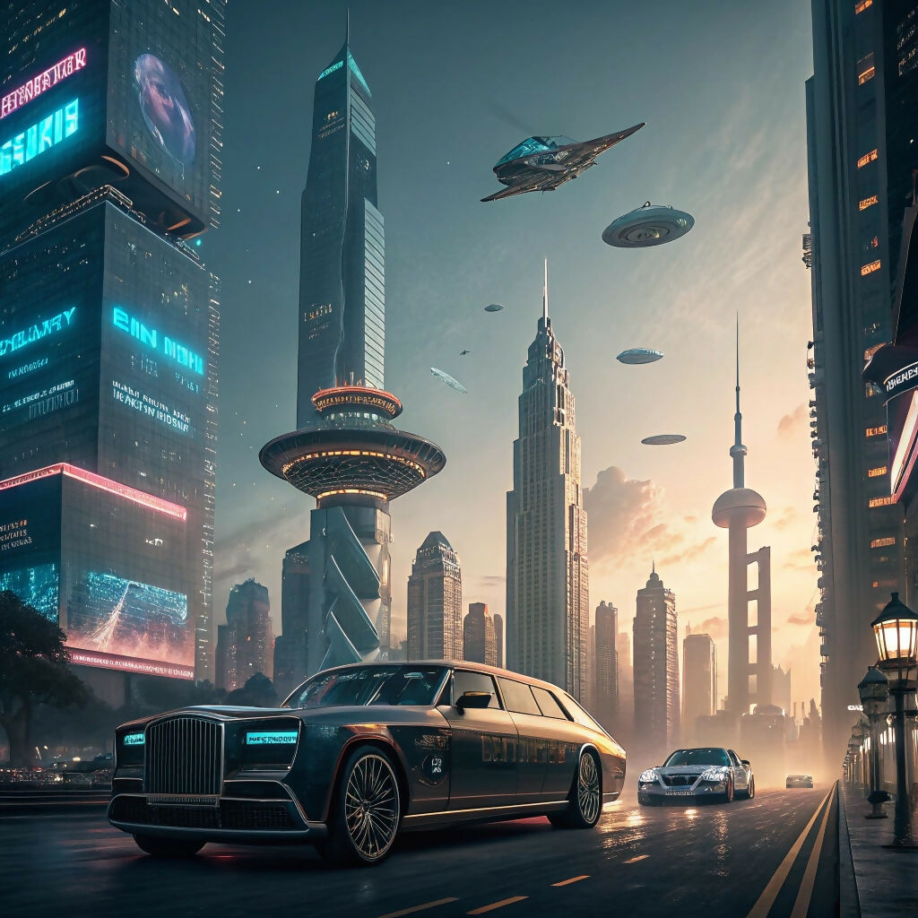 A futuristic cityscape stretches across the image. High-rise buildings, some with glowing digital displays, dominate the skyline. Unusual, saucer-shaped structures are interspersed among the skyscrapers. Several flying vehicles, including jet-like craft and flying saucers, are visible in the air above. A dark-coloured, large limousine is prominently displayed on a road that runs through the city. Another car, lighter in colour, follows it down the same road.
