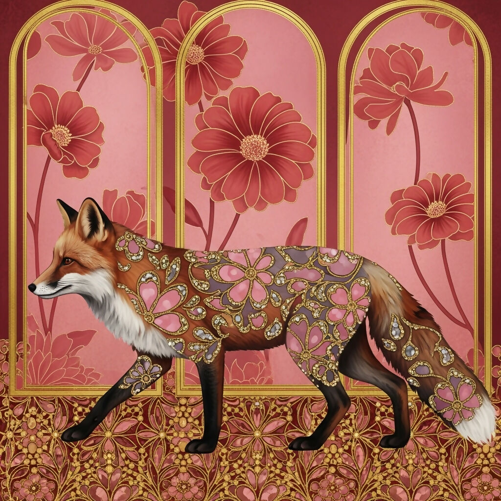 An elegant red fox walks gracefully across an ornate Art Nouveau backdrop, its fur transformed into intricate jewel-like floral patterns in pink, gold, and soft mauve. Delicate blossoms framed by arched panels echo the motifs on the fox’s coat, creating a harmonious, decorative composition. The warm rose and ruby palette, accented with gleaming golden linework, gives this piece a luxurious, storybook feel.